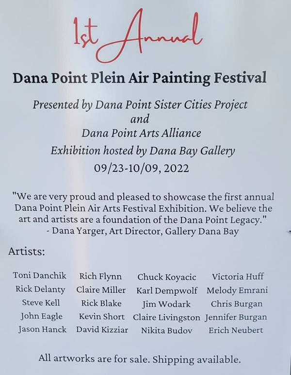 The first annual Dana Point Plein Air at the Maritime Festival will be September 9th to 11th around Dana Point. Artists will paint on location during the 3- day Festival.
